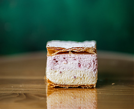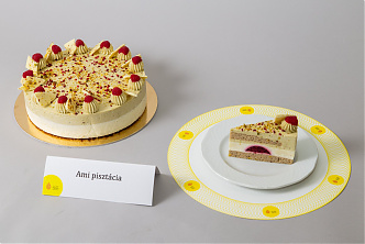 Ami Pisztácia Torta – mandula és zöldbanánlisztből készült piskóta alapon lágy fehércsokoládé – pisztácia mousse málna betéttel.